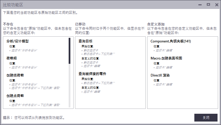 您可以将原始功能区与您所做的更改进行比较。您可以查看已添加和删除的内容,以及已移动到不同选项卡的内容。
