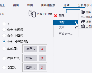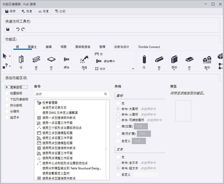 您可以添加、移动和重命名功能区选项卡,选择其对齐方式,并在当前工程中不需要某些选项卡时将其隐藏。例如,如果您仅对钢结构零件进行建模,则可以临时隐藏混凝土选项卡。
