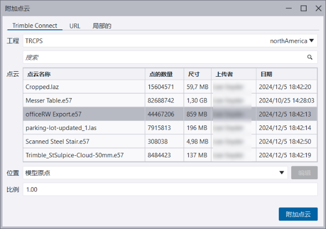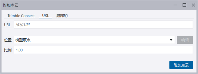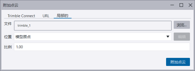 - 您可以从本地、互联网或使用 Trimble Reality Capture 平台服务 (TRCPS) 附加点云。