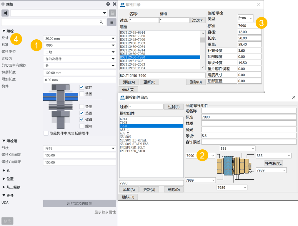 如何将螺栓目录和螺栓构件目录结合使用 (1)从螺栓构件目录读取螺栓标准选项。 (2) 螺栓构件目录定义在螺栓构件中使用哪个螺栓标准。 (3) 螺栓目录包含螺栓标准中使用的不同螺栓直径、长度和其它属性。 (4) 根据所选的螺栓标准选项,从螺栓目录中读取螺栓尺寸选项。