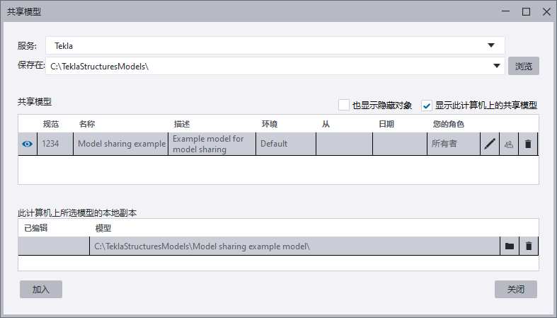 当您希望加入 Tekla Model Sharing 中的共享模型时,可以在文件 > 共享 > 浏览共享模型共享模型对话框中选择要加入的模型。