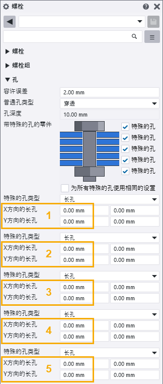 例如,SPECIAL_HOLE_1_X 表示最靠近螺栓头的第一个开槽零件中螺栓组 x 方向的槽孔余量,SPECIAL_HOLE_5_Y 表示第五个开槽零件中 y 方向的余量。