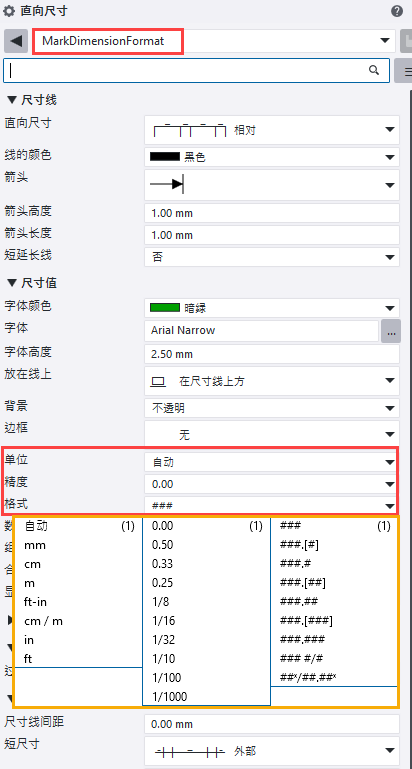 顶部标高采用 MarkDimensionFormat.dim 尺寸属性文件中的单位和精度。您可以在打开的图纸中的尺寸属性窗体中修改保存在 MarkDimensionFormat.dim 中的设置。