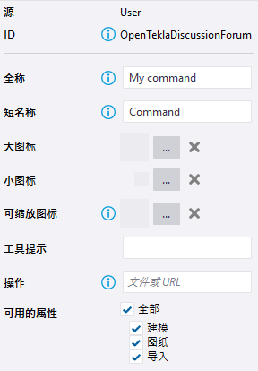 用户定义的命令将保存到 ..\Users\<user>\AppData\Local\Trimble\Tekla Structures\<version>\UI\Commands 文件夹。