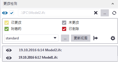 还会显示更改列表和属性细部列表。更改列表内容基于 IFC 内容,且包含所有物理对象类型。颜色与更改检测中的颜色相同。