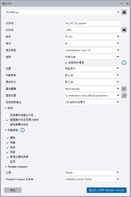 - 如果选择了某些对象类型,则输出不会输出所选内容。例如,如果选择混凝土零件并选中钢筋复选框,则会输出混凝土零件中的所有钢筋。无法选择哪些钢筋与部件一起输出。解决方法是生成两个 IFC 输出文件:一个仅包含混凝土零件,另一个仅包含所选钢筋。