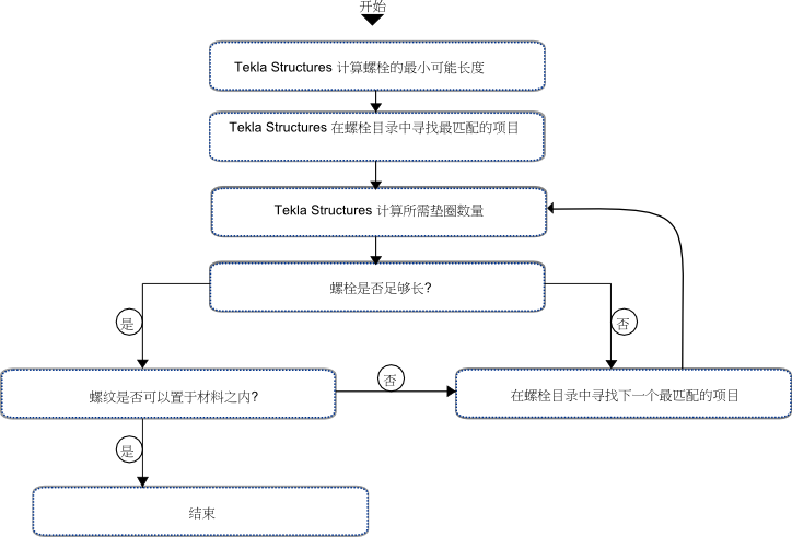 如果选定的螺栓不满足以上所列的所有条件,Tekla Structures 将返回步骤 2 并尝试下一个最长的螺栓。