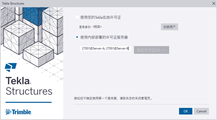 默认情况下,当 Tekla Structures 在计算机上首次启动时,系统会询问您旧版本地 Tekla 许可证服务器的地址。为了避免用户手动定义地址,您可以在自定义的初始化文件中预定义地址。