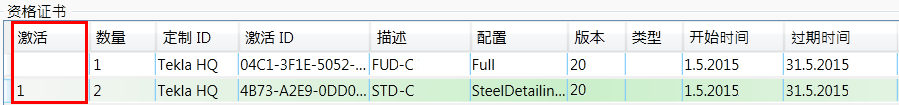 许可证信任状态显示在 Tekla License Administration Tool 中的激活证书区域。如果信任状态符号为绿色,则表示该信息受信任,如果为红色,则表示信息不受信任。