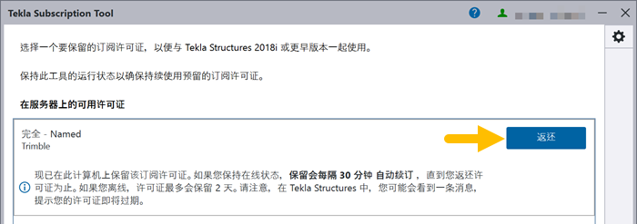 使用 Tekla Subscription Tool 归还您的订阅许可证